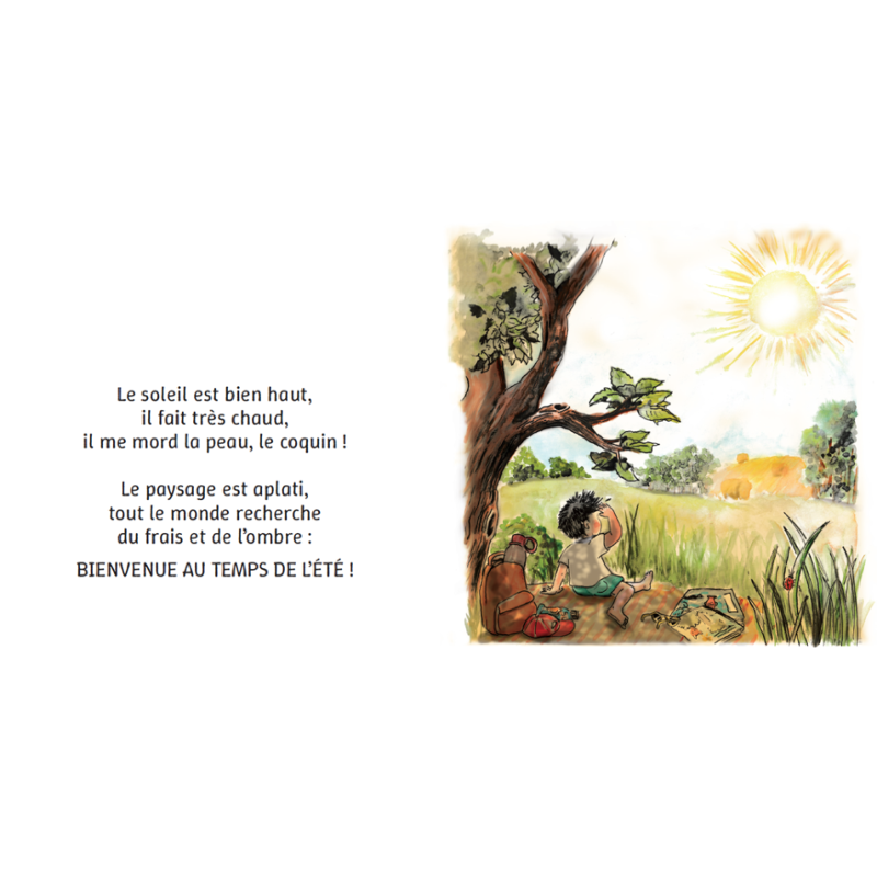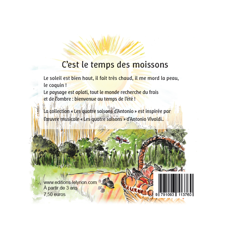L’été est une saison qui permet de présenter la nature et les animaux comme matures et fortifiés. Dans l'album "C'est le temps des moissons", le soleil est éclatant. Il s’agit aussi d'un temps augmenté avec les longues soirées passées entre amis ou en famille. Le petit Antonio vit cette période avec joie et intensité : jeux, danse, mais aussi prévention contre le soleil qui mord, ce coquin.